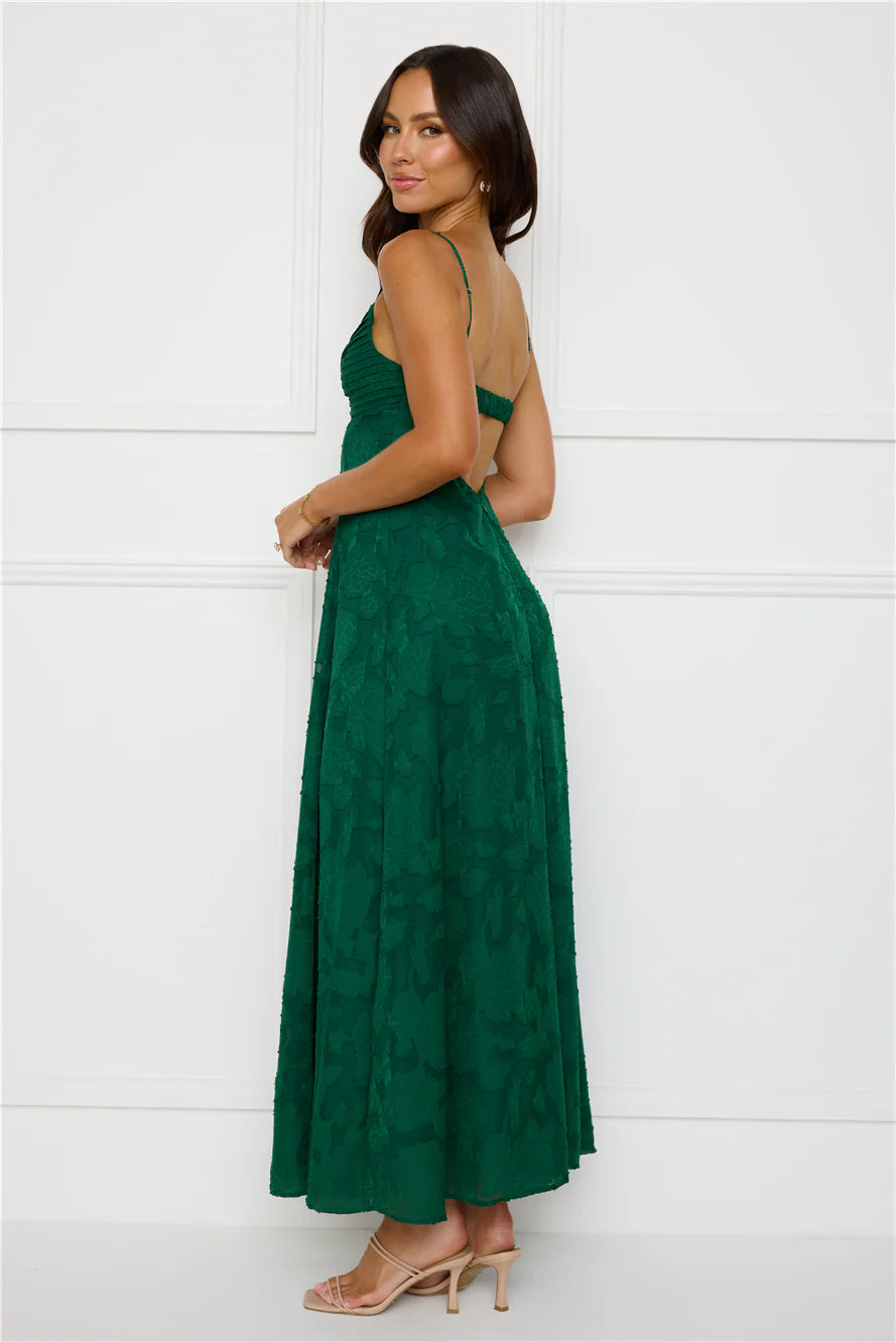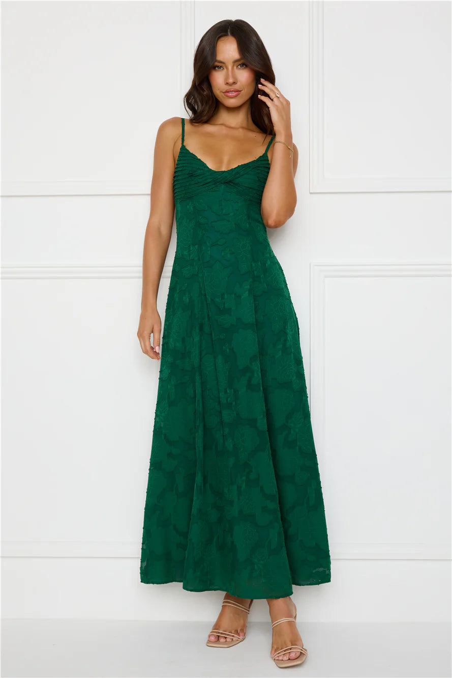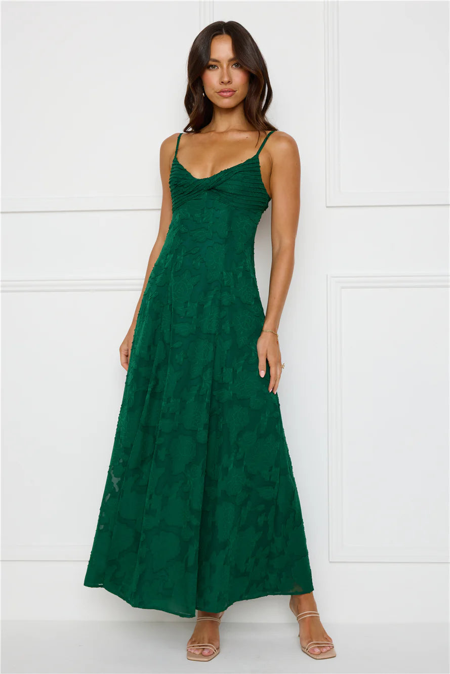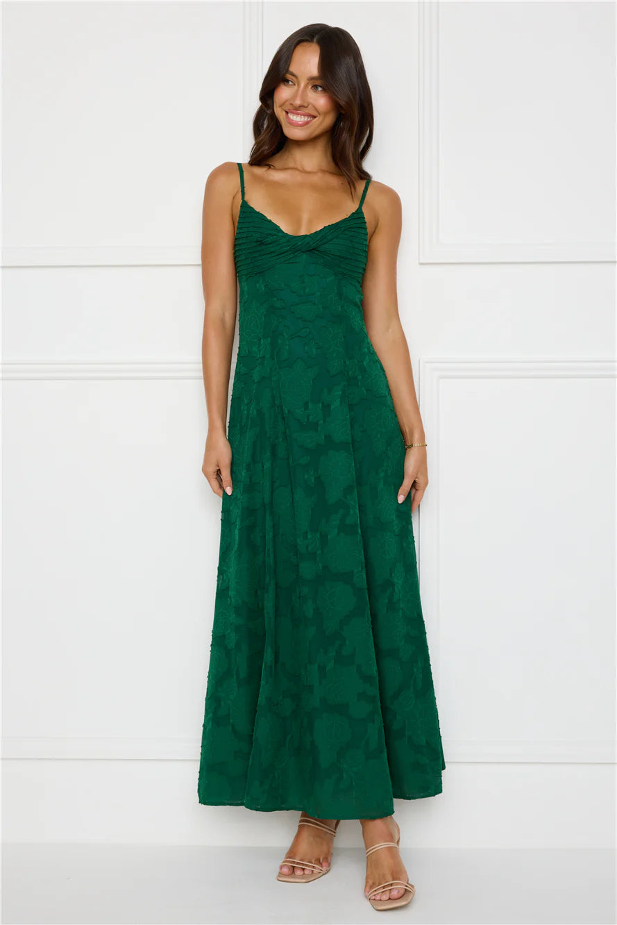 You're event ready now, lovely. Style the Pine Blossom Maxi Dress to impress. Featuring a pleated top, an elastic back and a gorgeous textured print. Style with heels and curls for all the likes!