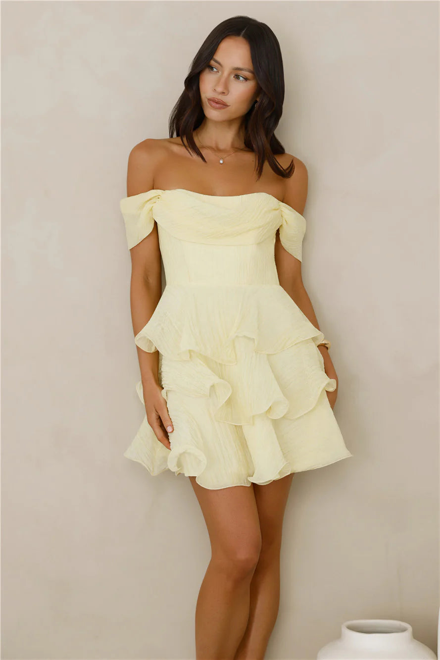 The Pretty In The Sun Off Shoulder Mini Dress features a flattering off-the-shoulder design with a structured bodice and boning for added support. The tiered, flowy skirt adds a playful touch, making it a perfect choice for a sunny day out with sandals.