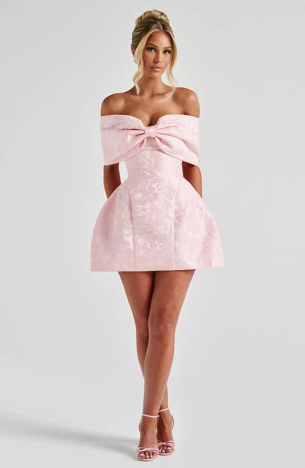 Turn heads in the enchanting Raquel Mini Dress, crafted from non-stretch floral jacquard fabric for a luxe, feminine feel. The oversized bardot bow neckline exudes elegance, while the lace-up back and panelled tulip skirt with pleated hips create a flattering, sculpted silhouette. Perfect for cocktail parties, weddings, or date nights, this mini-length stunner pairs effortlessly with strappy heels and a statement clutch for a sophisticated look.