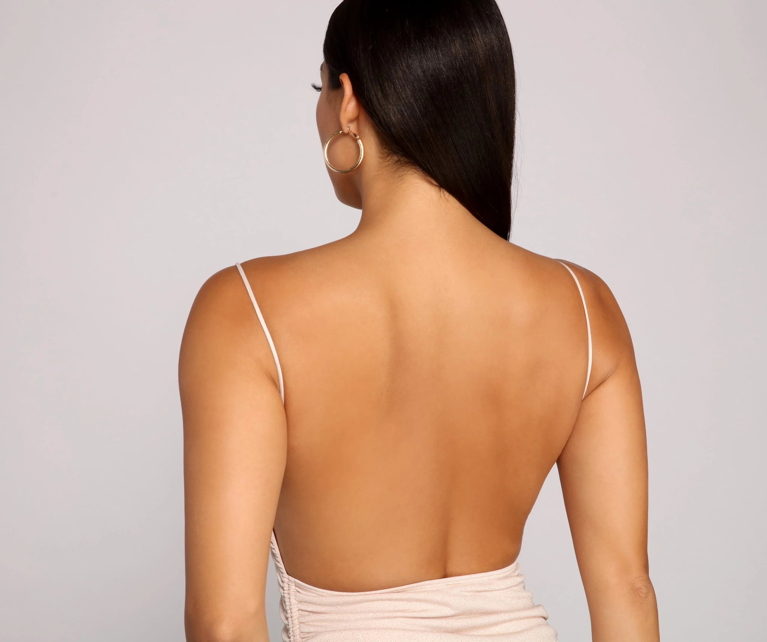 Get ready to glow with a mini dress that brings the shine to your outfit! The dress features a sleeveless square neckline, sleek spaghetti straps, a sultry backless design, and side ruching with dual drawstrings. The dress is composed of a glitter knit fabric that offers a form-hugging fit with a moderate stretch. Complete the look with .