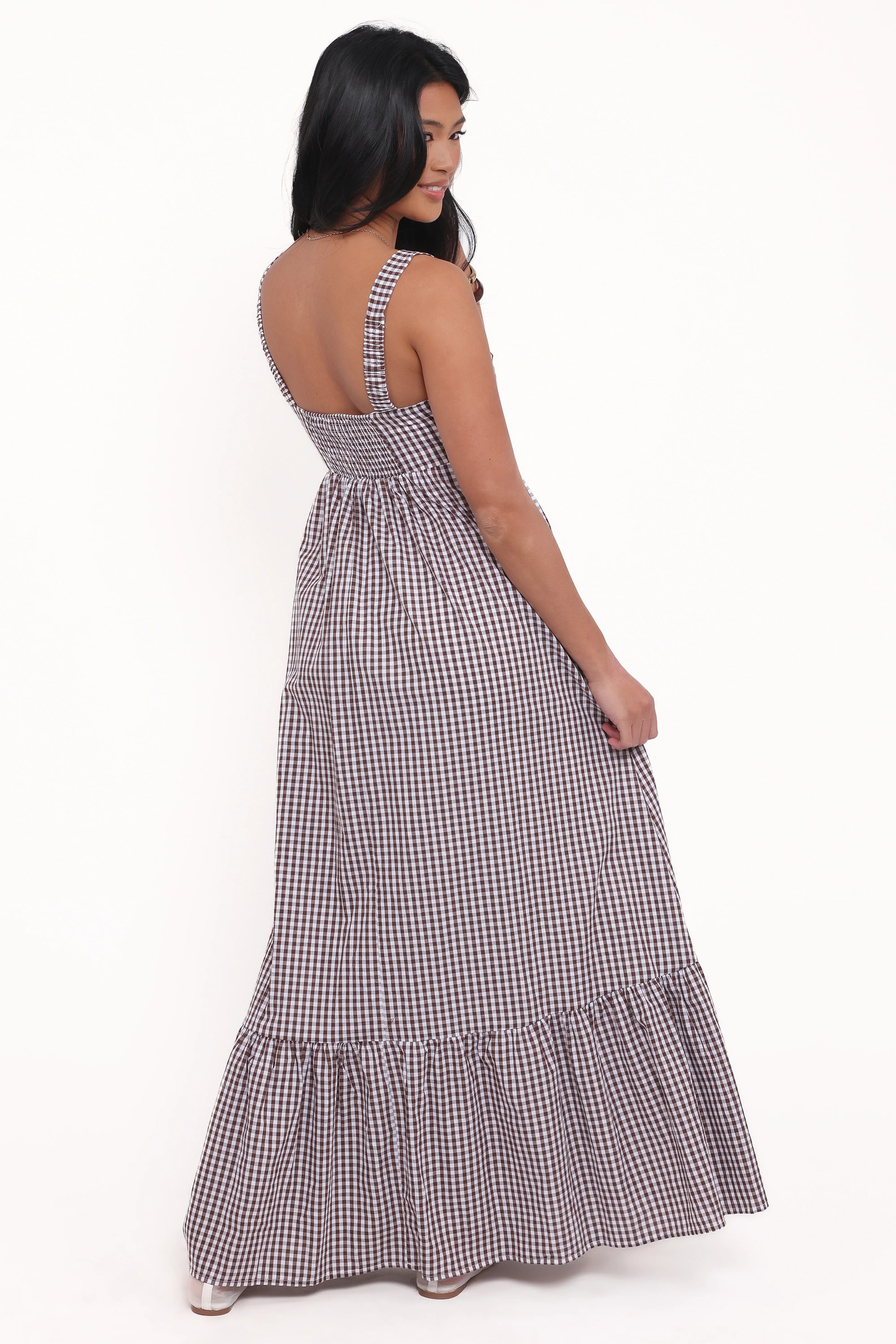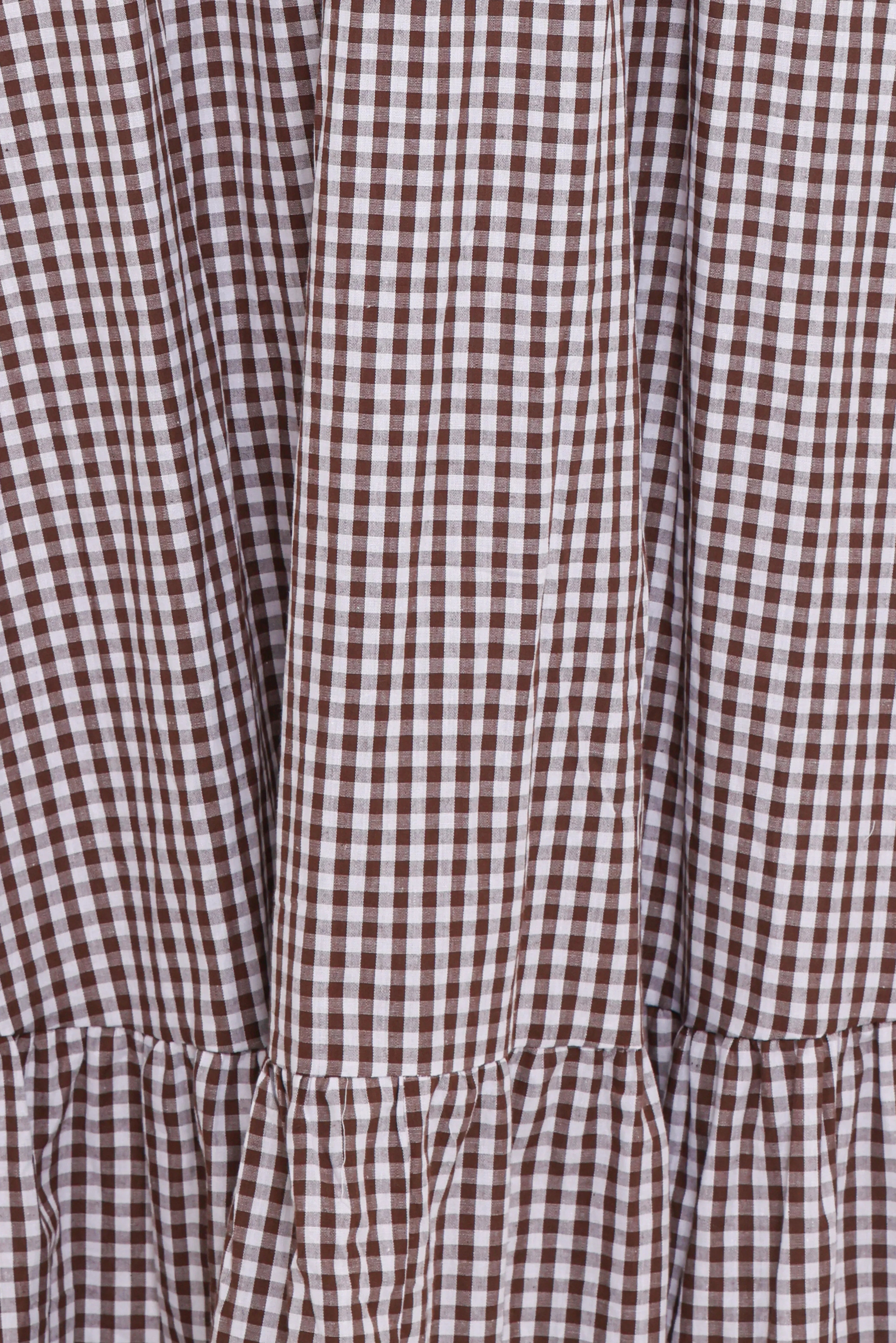 DETAILS Step into effortless elegance with the Reid Maxi Dress - Brown Gingham, the perfect blend of comfort and chic style. With its flowing maxi length and a flattering empire waist, this dress creates a graceful silhouette for any occasion.