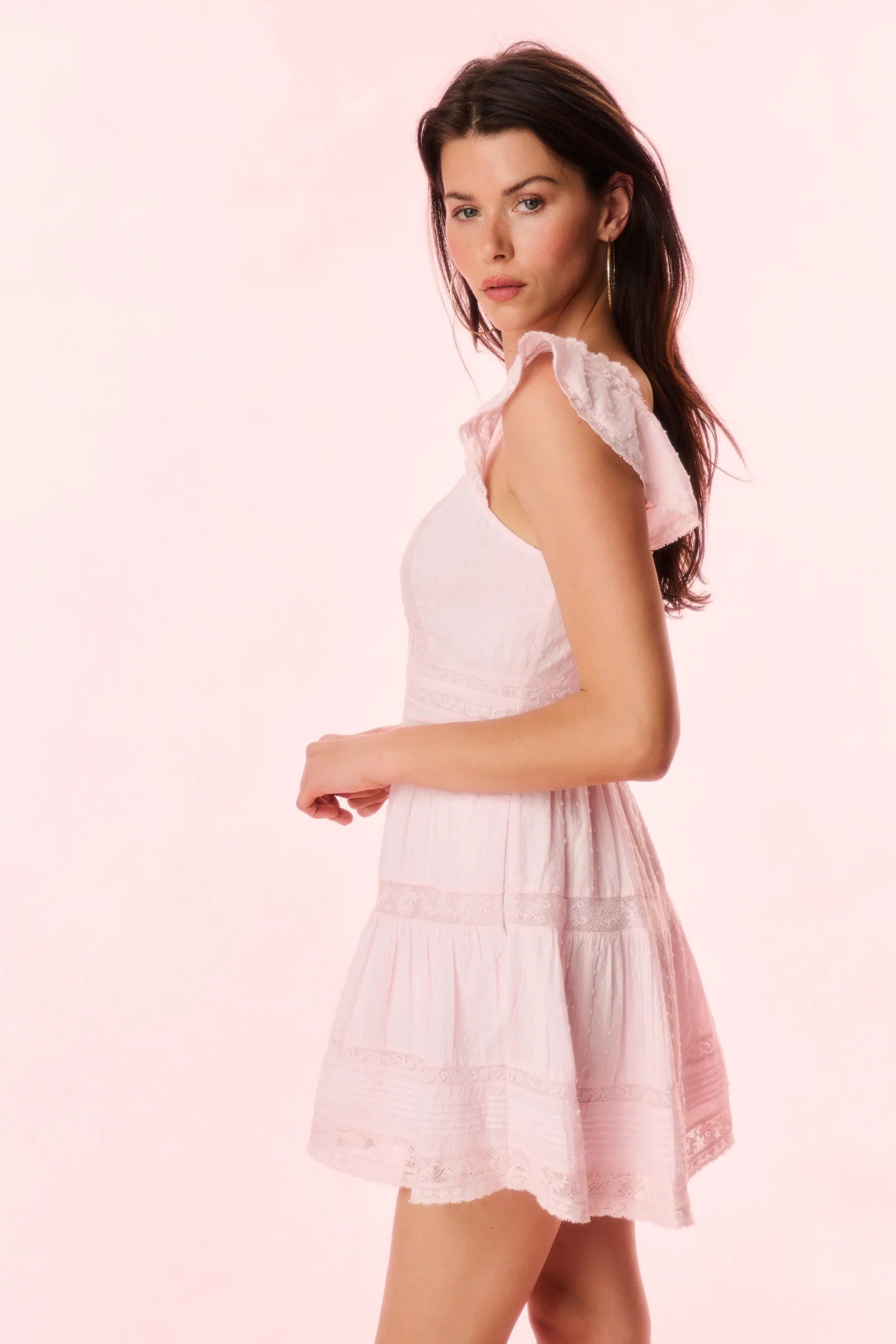This charming mini debuts with a cotton fabric adorned with vintage-inspired laces and tucking throughout. The piece begins with short flutter sleeves above an open, round neckline that falls to a center front, non-functional placket above a fixed waist yoke. The dress has smocking at the back for an easy and comfortable wear and includes pockets.