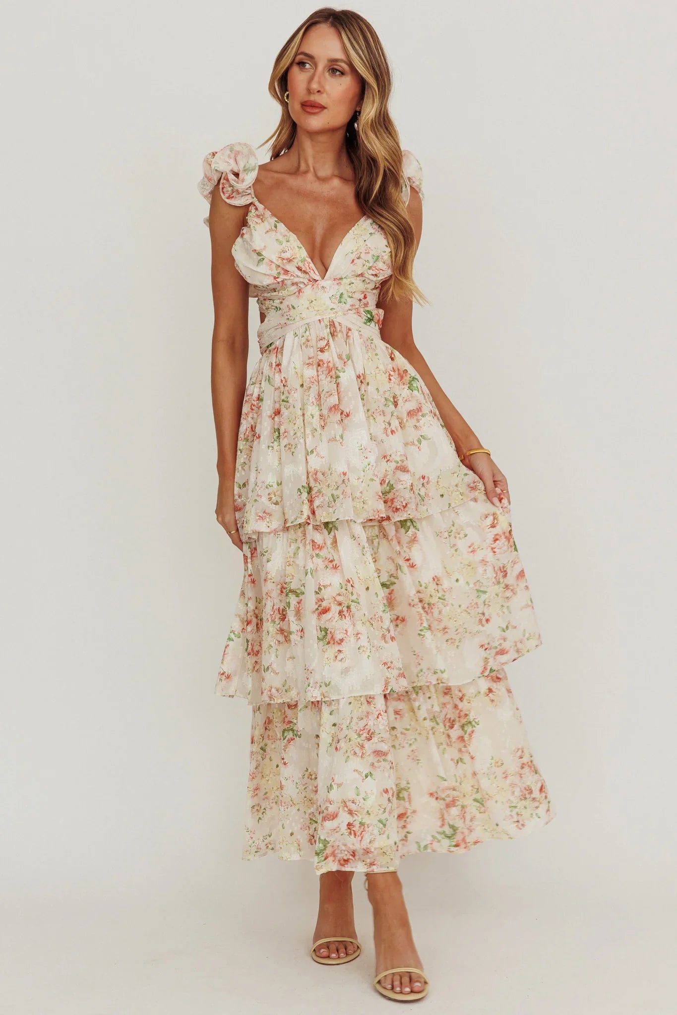 Embrace a carefree and feminine look with our Roselle maxi dress. The tiered ruffles adds movement to your ensemble making it the perfect dress for twirling through sunny days. From picnics to special occasions, this dress is your go-to choice for easy, breezy style. Pair it with your favourite jewellery and heels for a chic ensemble.