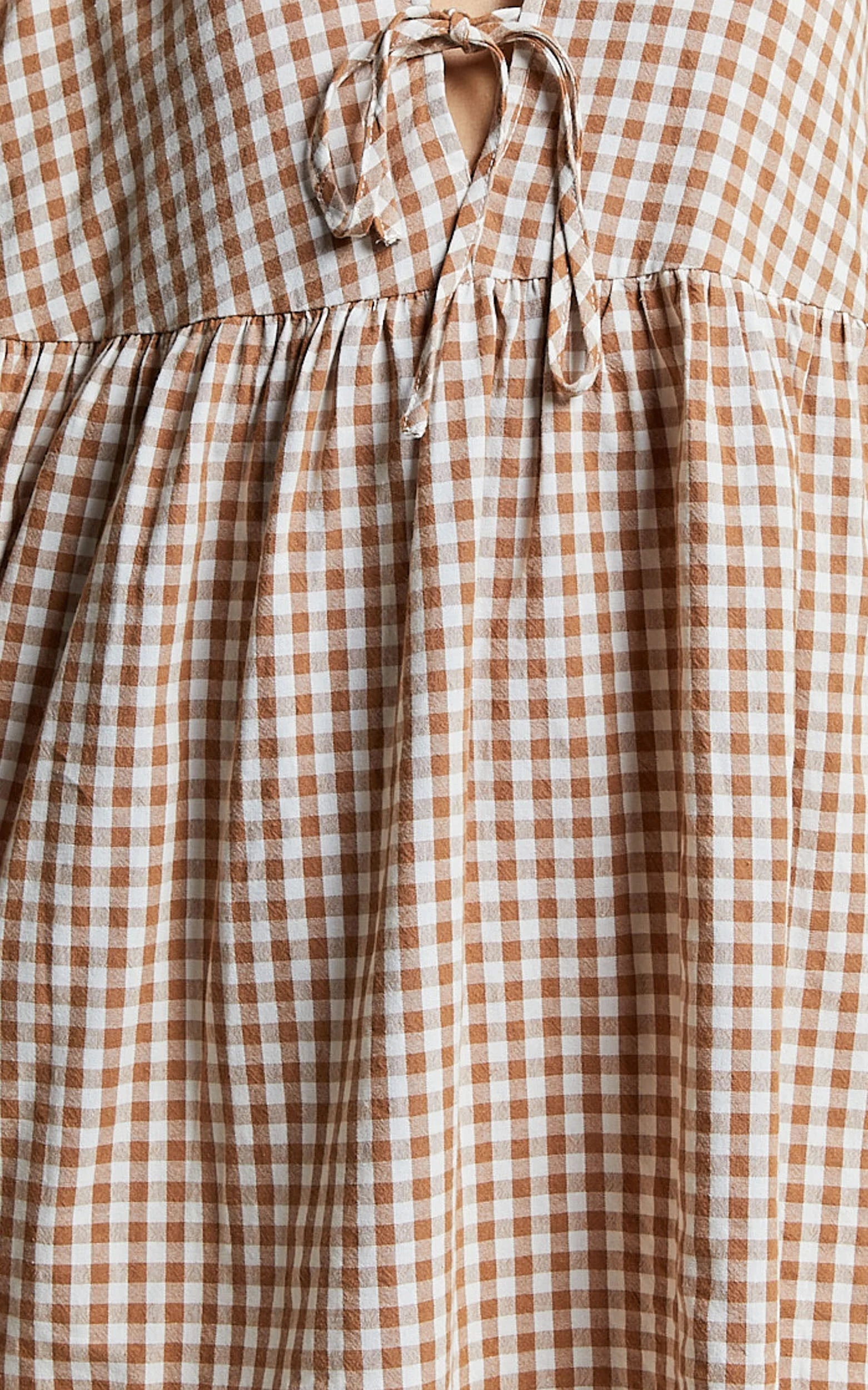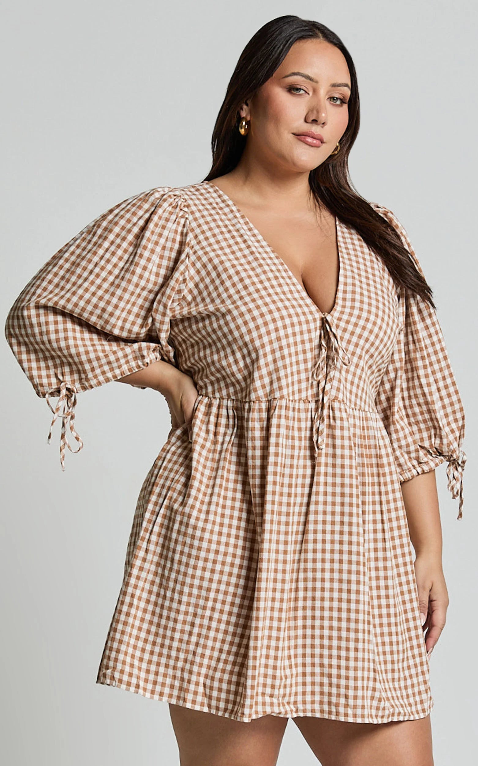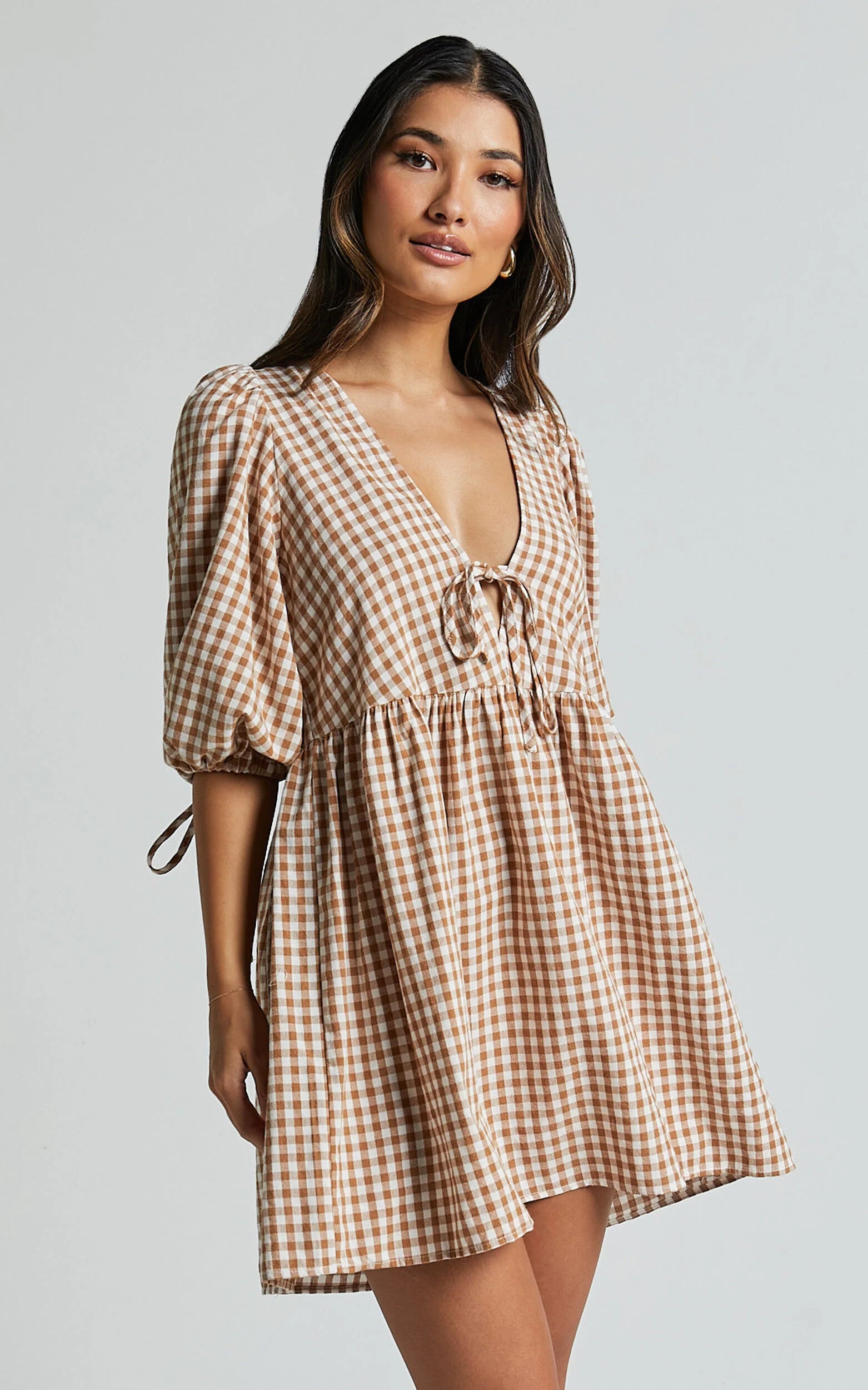 Add a touch of sweetness to your wardrobe with our Rosita Mini Dress in Caramel & White Gingham. This adorable dress features a flattering V neck and tie front detail, perfect for any casual day out or weekend activity. Made from soft cotton fabric, it offers both comfort and style. The 3/4 sleeves add an extra feminine touch to this mini dress that is sure to turn heads wherever you go. Embrace your individuality and rock this brown gingham beauty for a look that exudes confidence and charm.