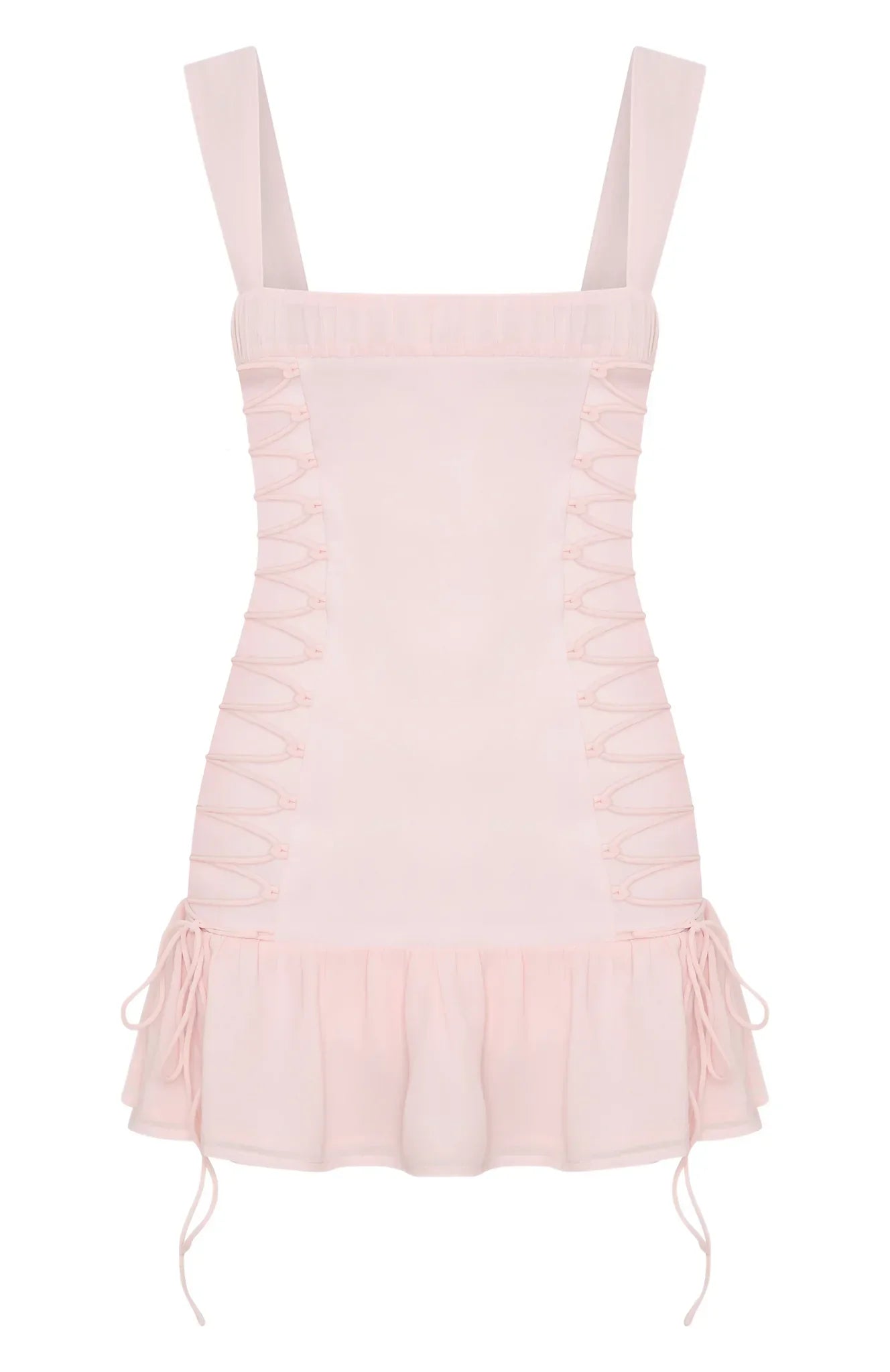 Soak up the desert sun in the Rush In Mini Dress Baby Pink! Featuring thick shoulder straps, ruched bust detailing, side lace up detailing, mini length with frill hem and invisible back zipper/clasp closure. Its giving queen behaviour!