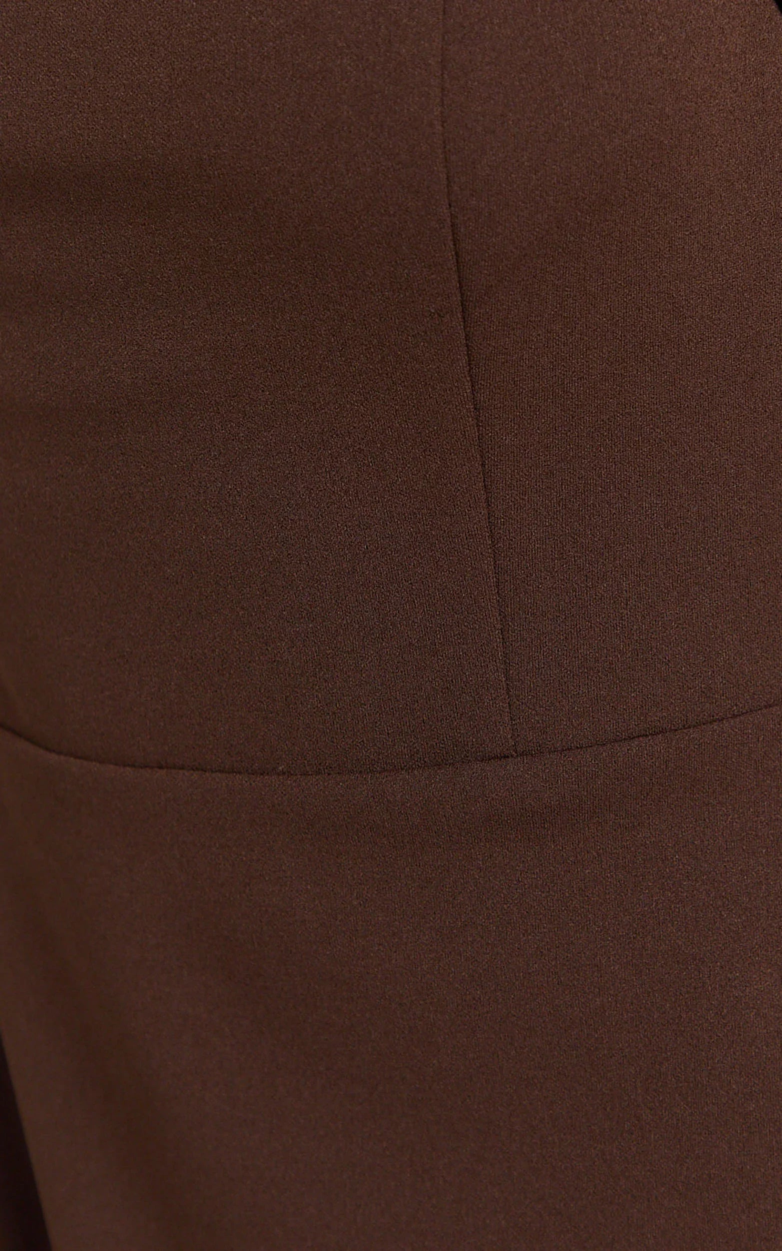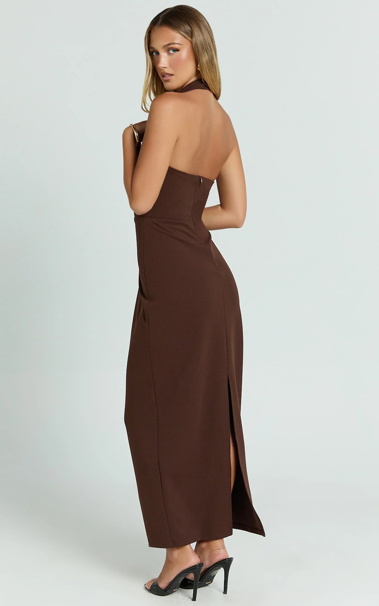 This halter neck column silhouette skims and elongates for an effortlessly polished vibe, perfect for date nights, weddings or cocktail hour. A rich brown tone keeps it elevated while the open back and ties add a little drama. Style this midi with mesh flats or jelly sandals for a cool-girl edge and tap into the moment with subtle rosettes or a butter yellow accessory for contrast.