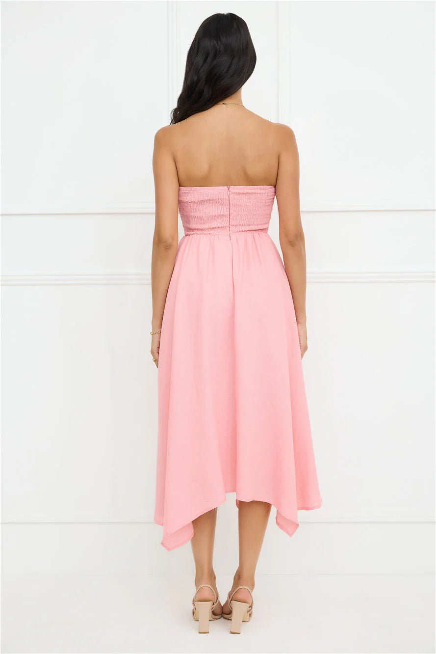 Embrace your free spirit in the Saltwater Soul Strapless Midi Dress, with a stunning asymmetric hem, a tie to the neckline, a flowy skirt, and an elastic back that gives you both comfort and style for those sun-kissed days. Style with sandals.