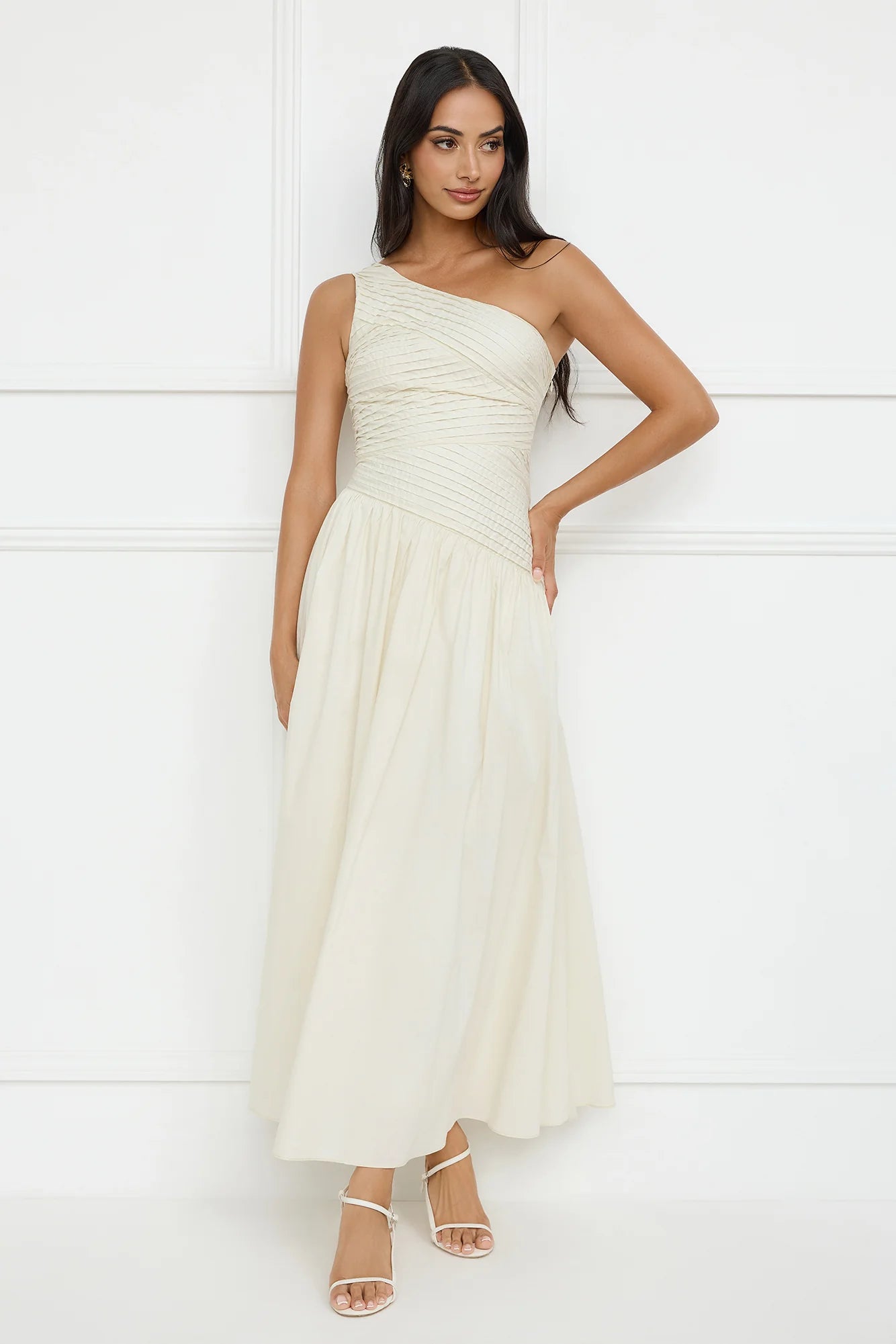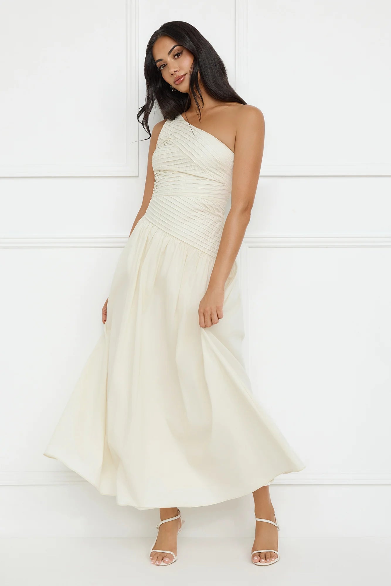 The Seashell Moments One Shoulder Maxi Dress features a flattering one-shoulder design, with a pleated bodice and a flowy skirt that moves with every step—perfect for creating an effortlessly chic look. Style with heels.