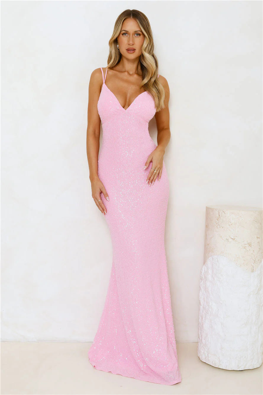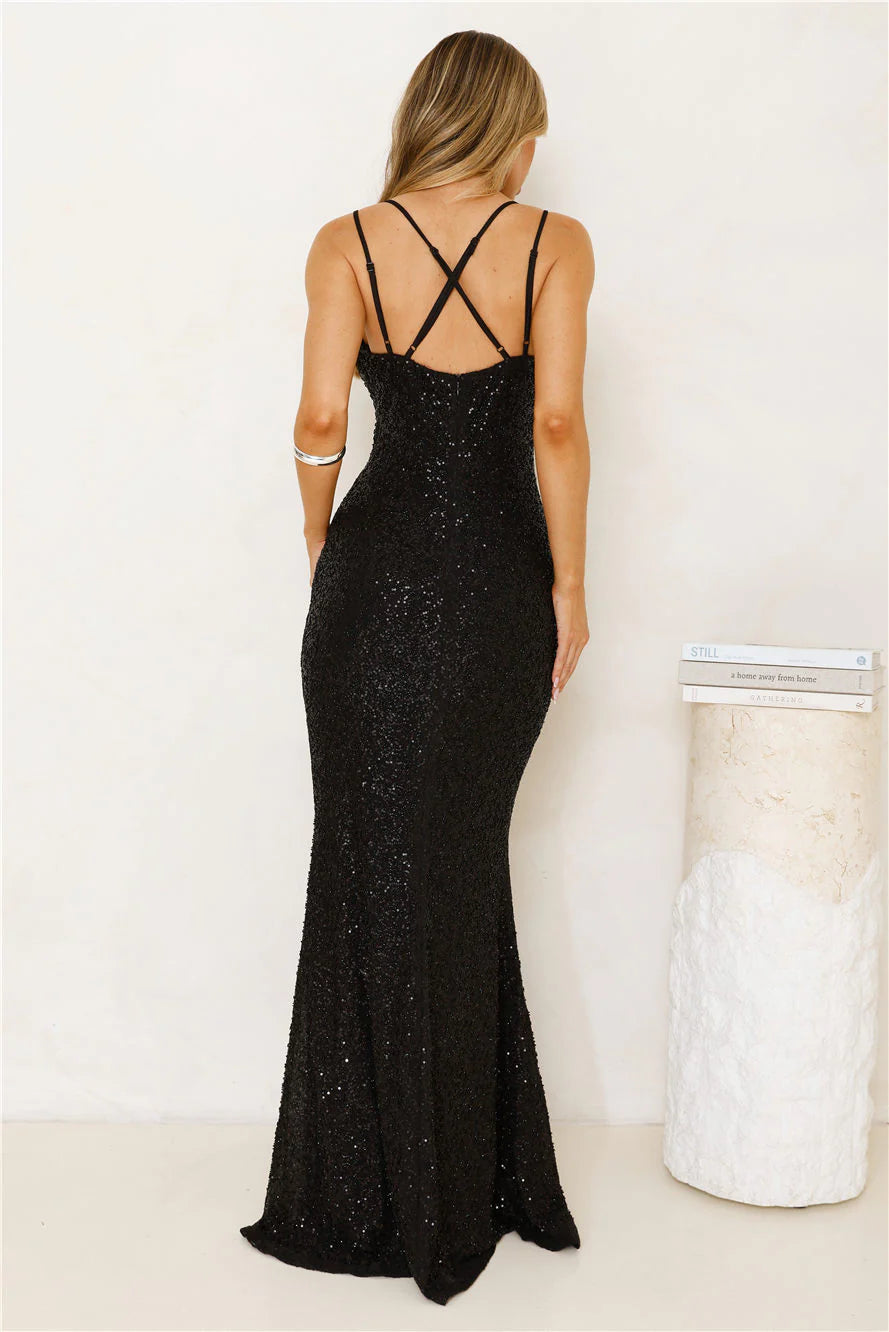 The Shimmering Elegance Maxi Dress Black combines stretch fabric with a crisscross back, padded support, and delicate beading, making it an exquisite choice for a formal event. Style with heels and accessories.