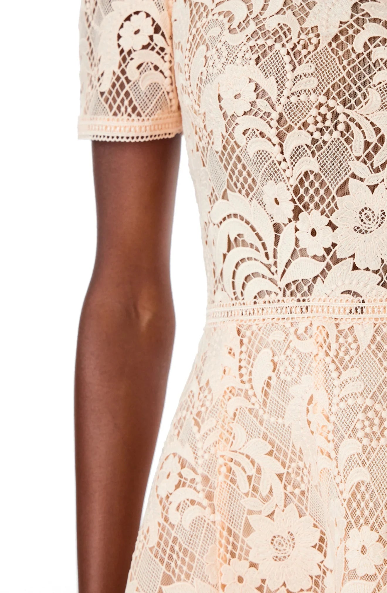 Jewel neck. short sleeve lace cocktail dress with fit and flare skirt.