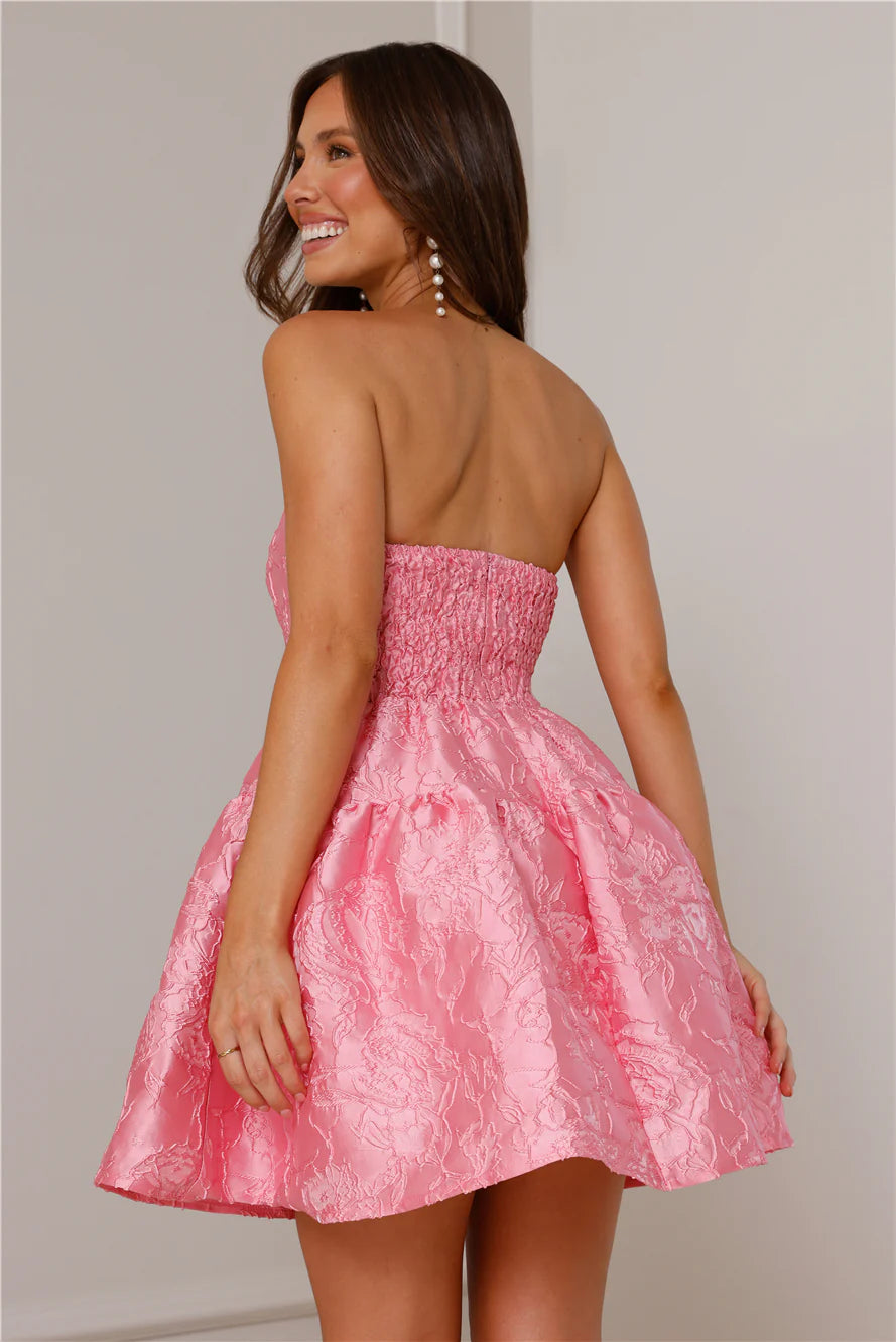 Lovely, this dress is on every girl's wishlist! The Silhouette Of Dreams Strapless Mini Dress features an elastic back, a textured pattern, and a flared skirt. Style with heels to make the skirt pop.