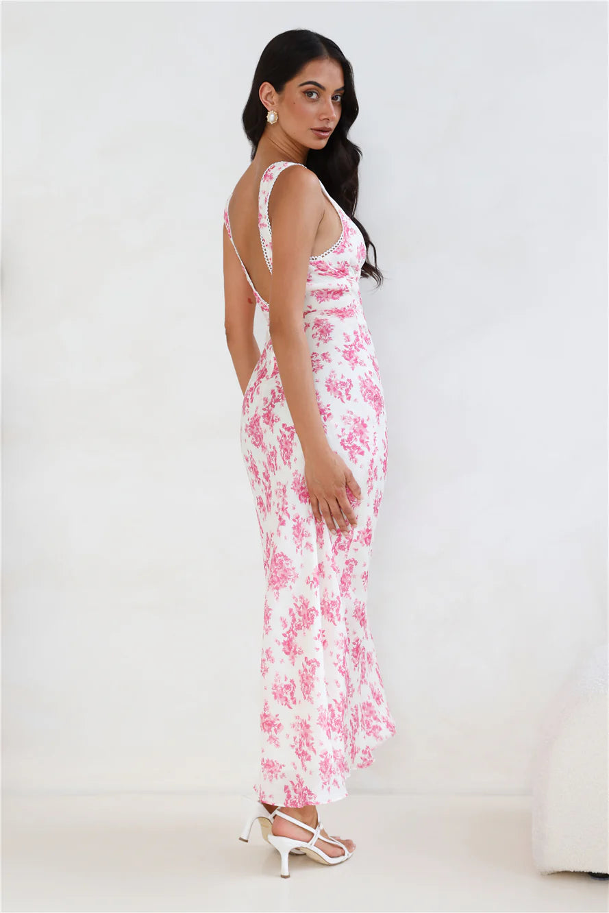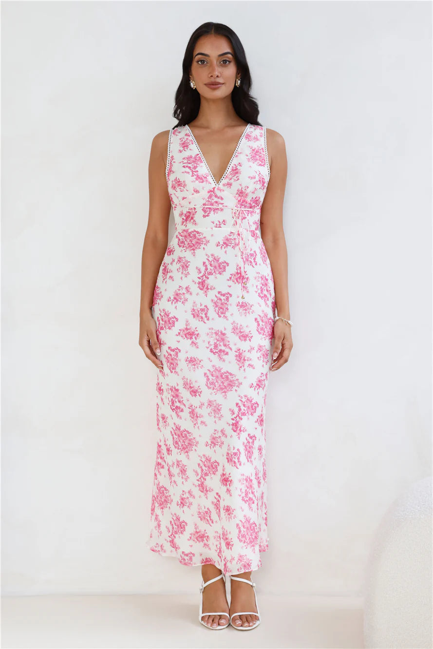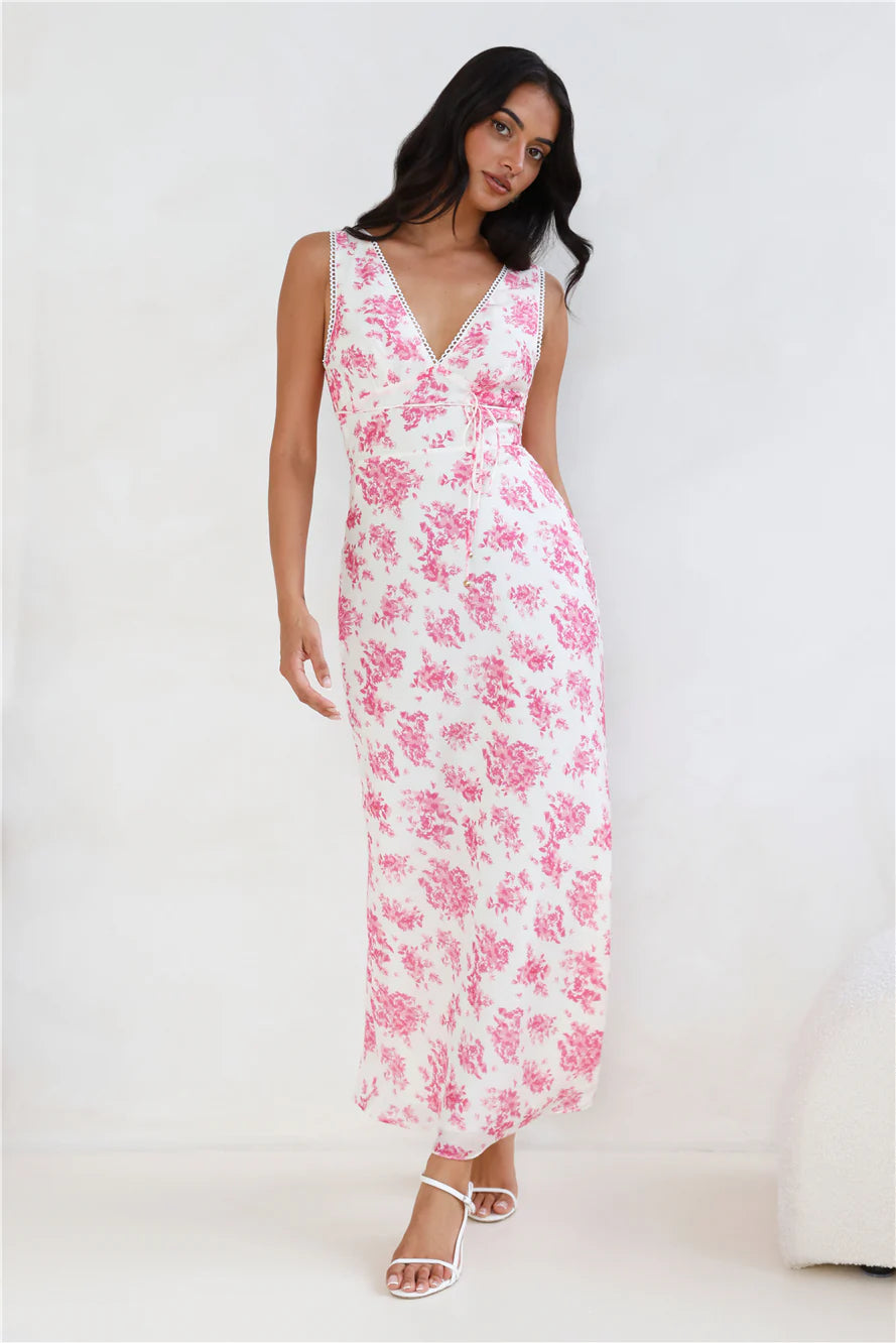 You're going to love the fit of this dress, lovely. The Soft Florals Maxi Dress features a gorgeous blue print, a straight, flowy skirt and a waist tie. Style with heels and curls for all the likes.