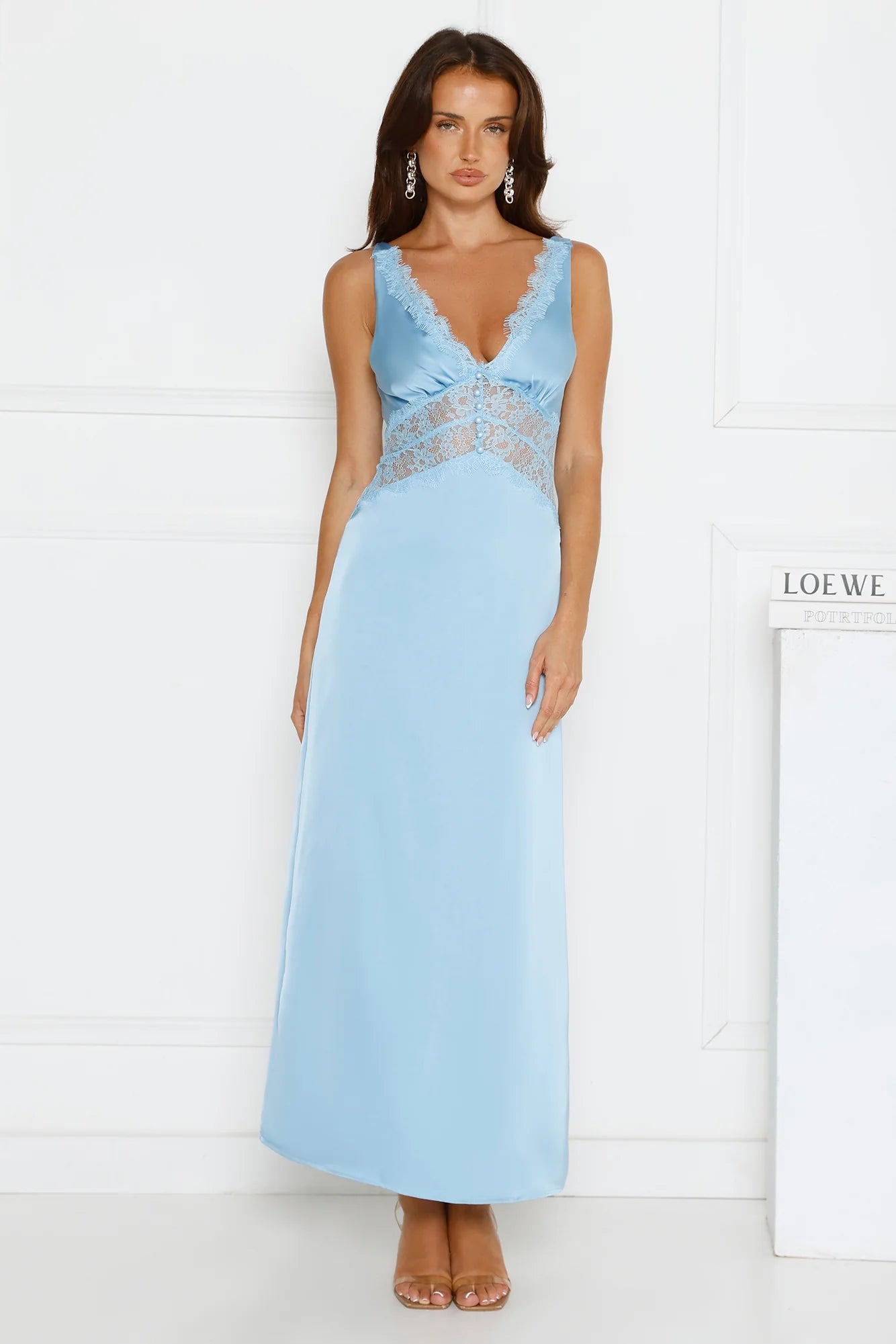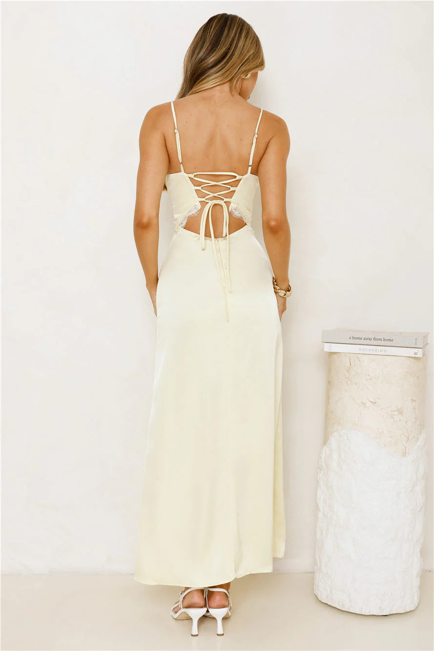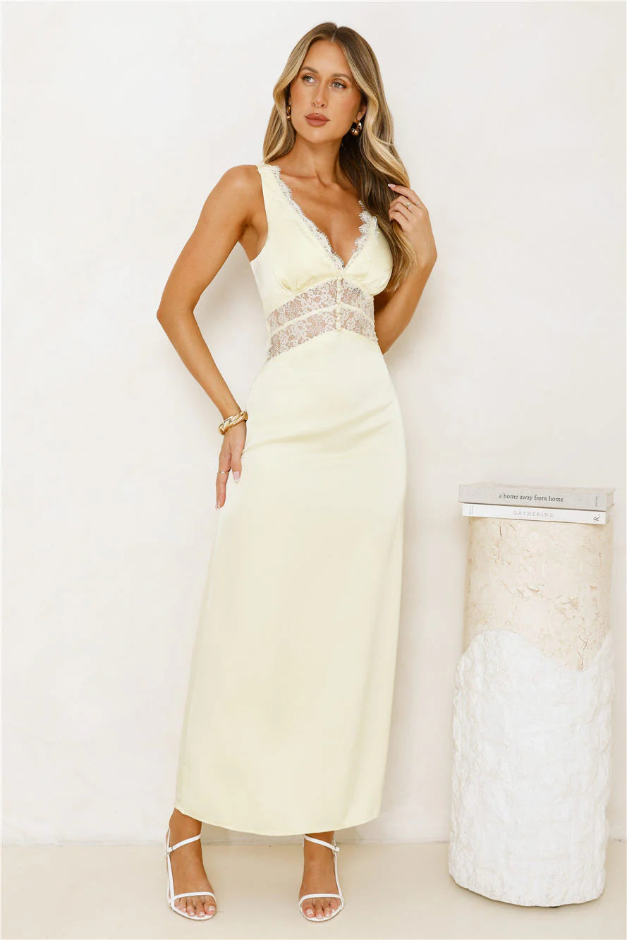 The Softly In Season Satin Maxi Dress brings elegance with its satin finish, delicate lace details, faux button front, sheer bodice, and a crisscross back — perfect for glowing golden moments. Style with heels.