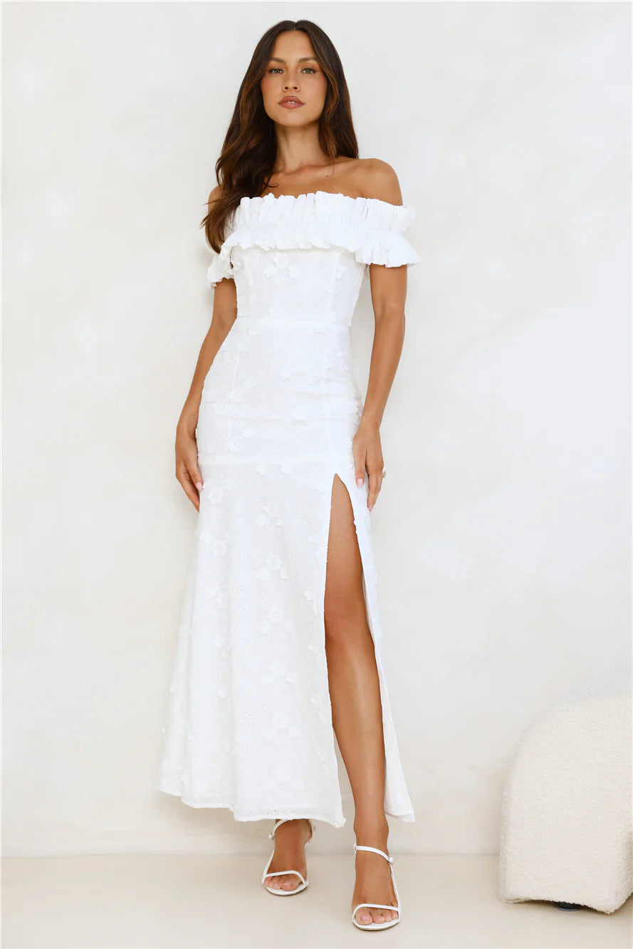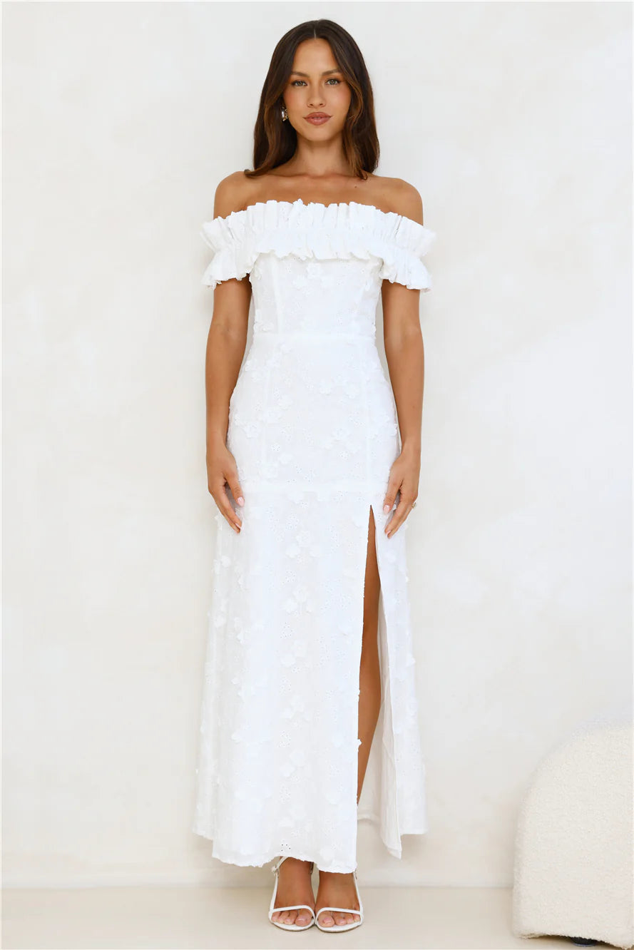 Lovely, this dreamy dress was designed exclusively for you. The Spring Serenade Off Shoulder Maxi Dress features an elastic off-the-shoulder neckline, an embroidered silhouette, and a cutout back—perfect for those warm, breezy days. Style with heels and soft curls for a look that’ll get all the likes!