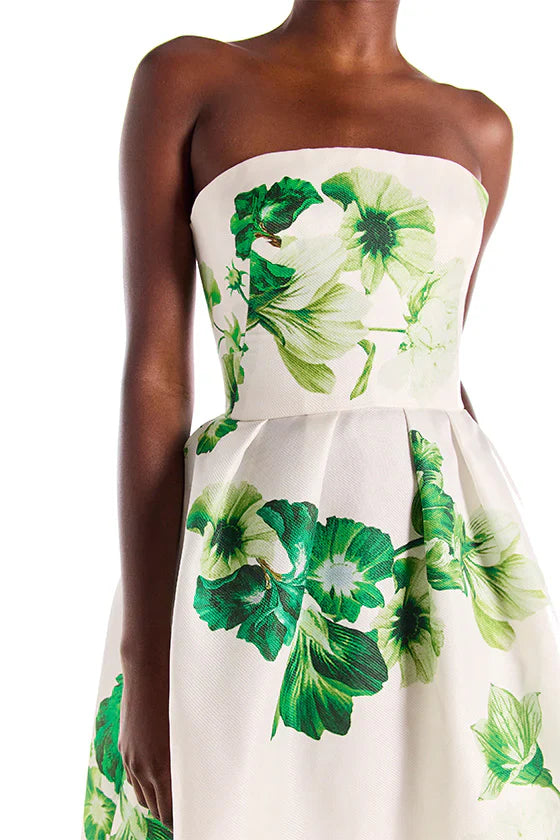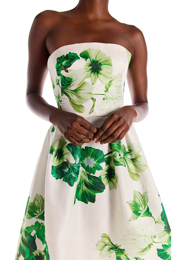 Strapless midi-length dress in Silk White & Green Floral Pique Gazar.