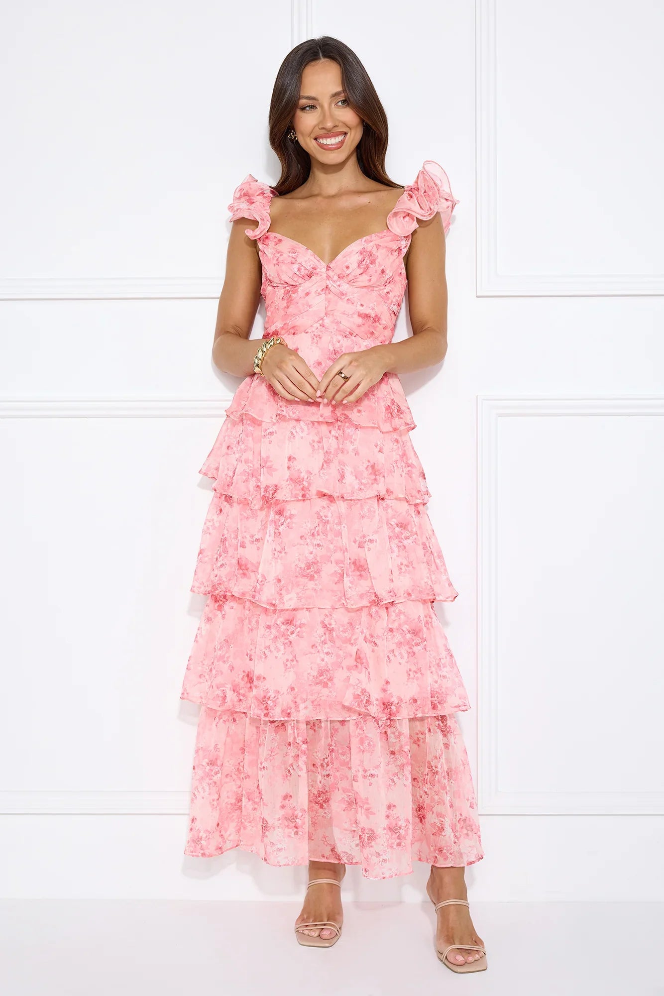 Be admired for your gorgeous style in the Sunbeam Soiree Maxi Dress. It features elastic shoulder straps with frill detailing and a tiered skirt. Style this dreamy dress with heels!