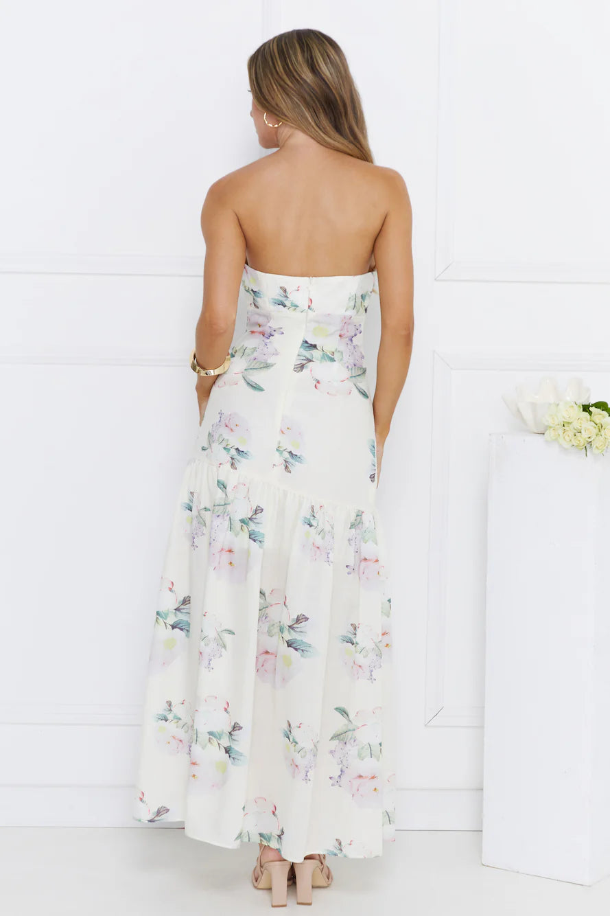 Be admired for your gorgeous style in the Sunset Whispers Strapless Maxi Dress. It features a strapless neckline, a fitted body and a flowy skirt. Style this dreamy dress with heels!