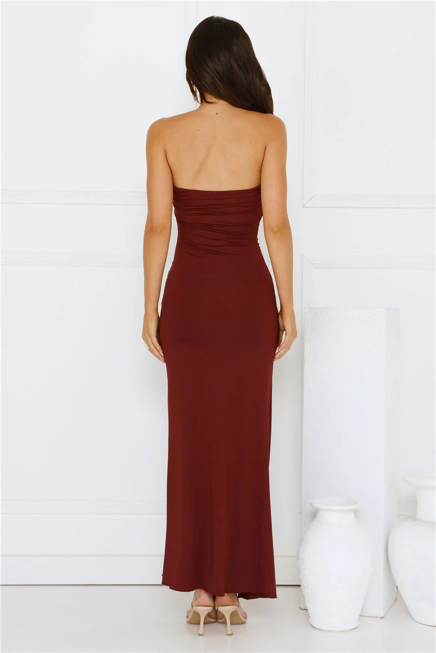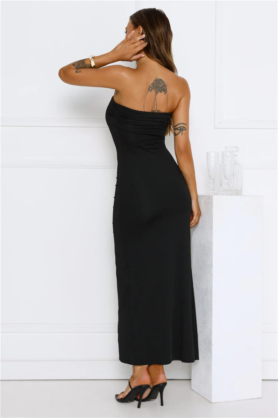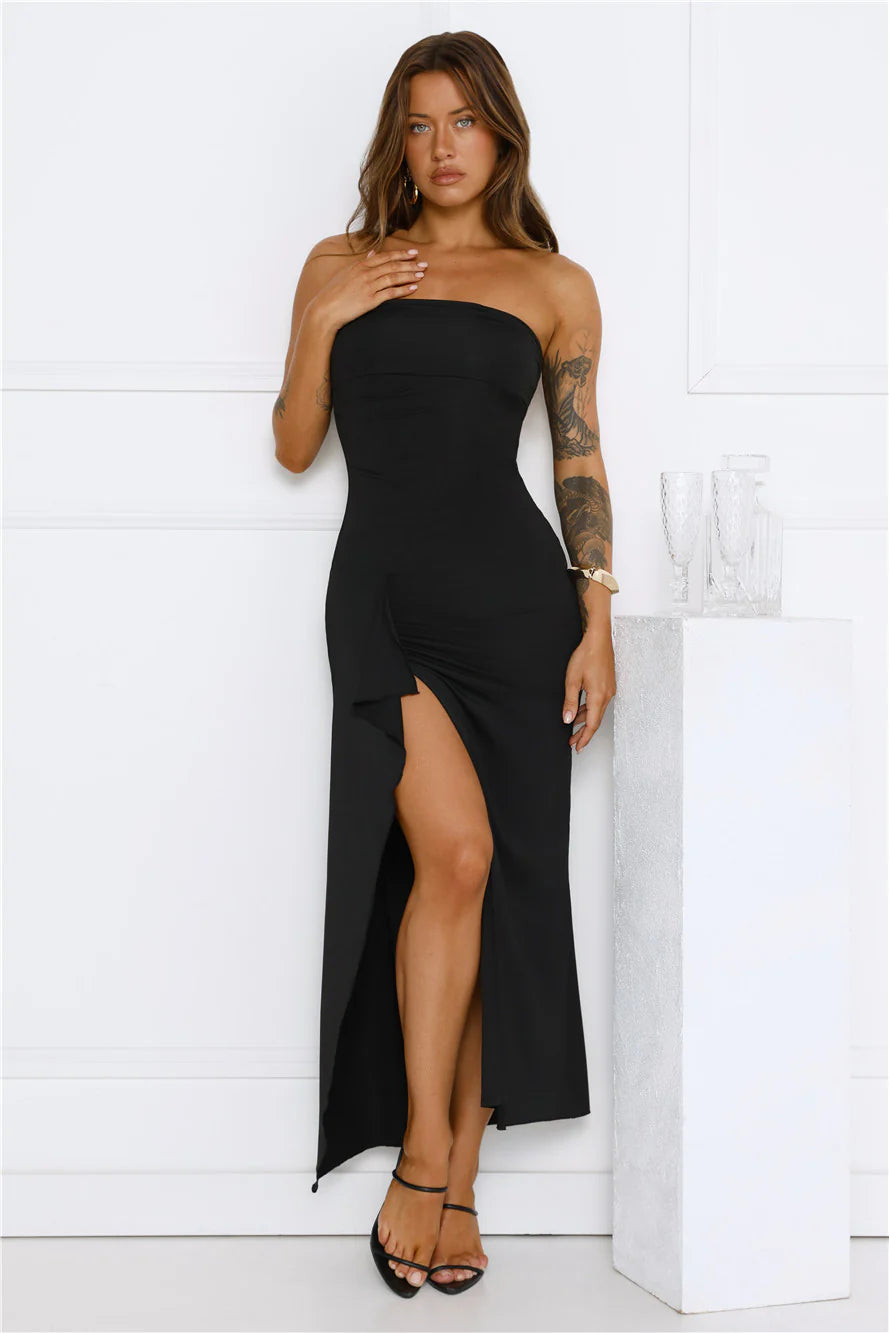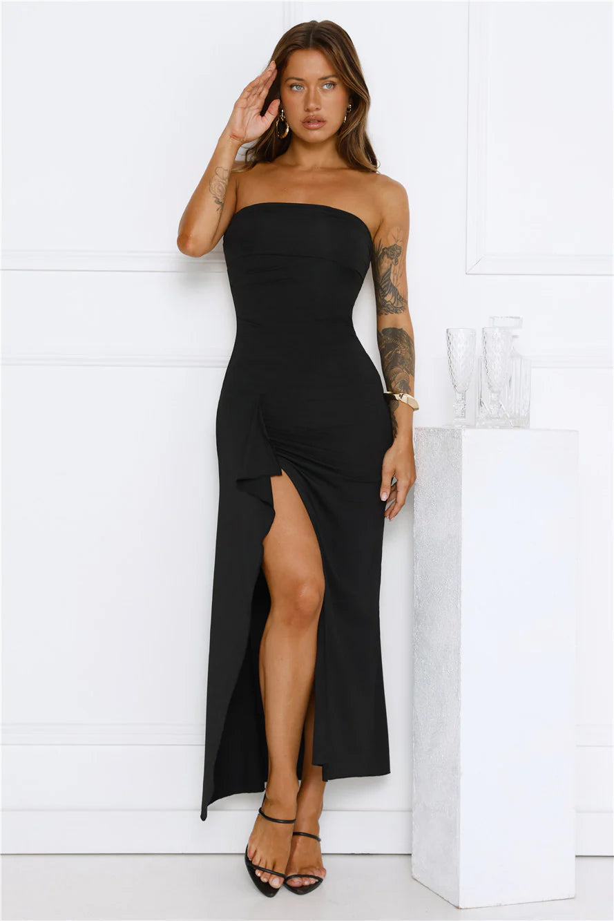 The Sunshine Shuffle Strapless Maxi Dress brings flirty vibes with its strapless neckline, flowy skirt and frill detail to the split. Style with heels for a fancy event.