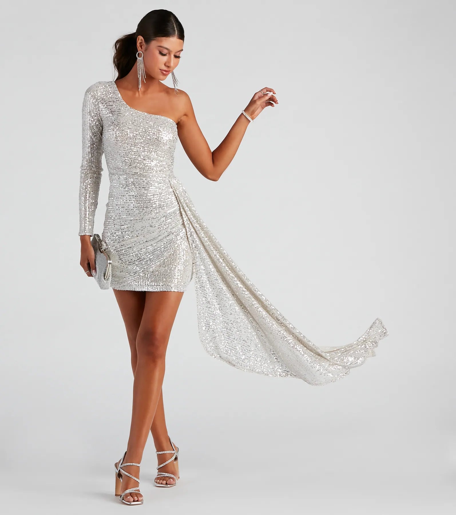 Channel a look that is over the top with a formal mini dress that brings the glitz! Talulla features a one-shoulder neckline with a secure no-slip strip, a fitted long sleeve, sparkling sequins throughout, a mini-length silhouette, and a draped train accent. The mini dress is composed of a lined mesh fabric that offers a form-hugging fit with minimal stretch. Complete the look with and door-knocker earrings. Be sure to shop this dress in the other luxe fabrications!