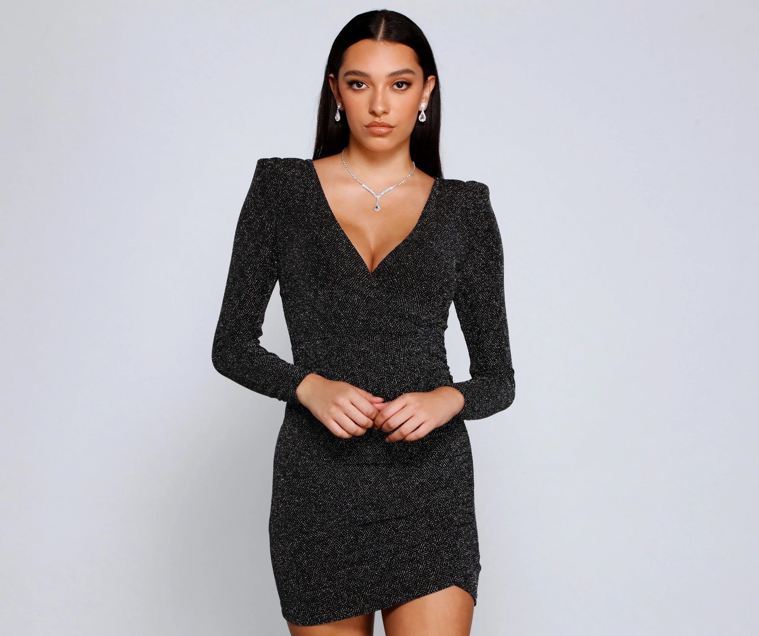 Get ready to glow with a mini dress that illuminates the night! The dress features a wrap V-neckline, long sleeves with lightly padded shoulders, and a mini-length silhouette with an envelope hem. The dress is composed of a dazzling glitter knit fabric that offers a form hugging fit with a moderate stretch. Complete look with rhinestone heels and a .