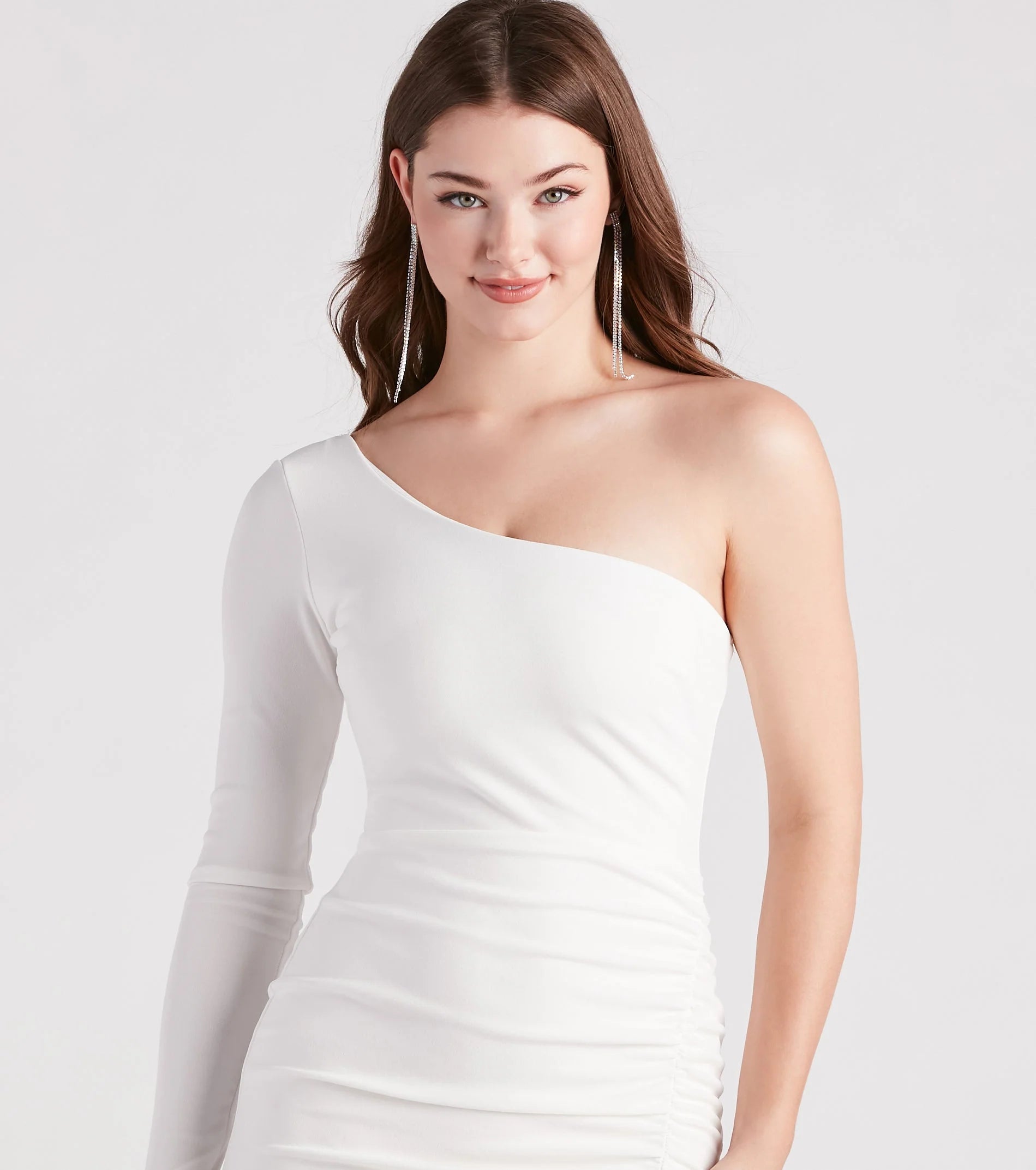 You'll be too chic to handle in this must-have mini dress. It features a one-shoulder neckline, a long fitted sleeve, ruching down one side leading to a sultry front slit, and a short, curve-hugging silhouette. Style this dress with for a night out.
