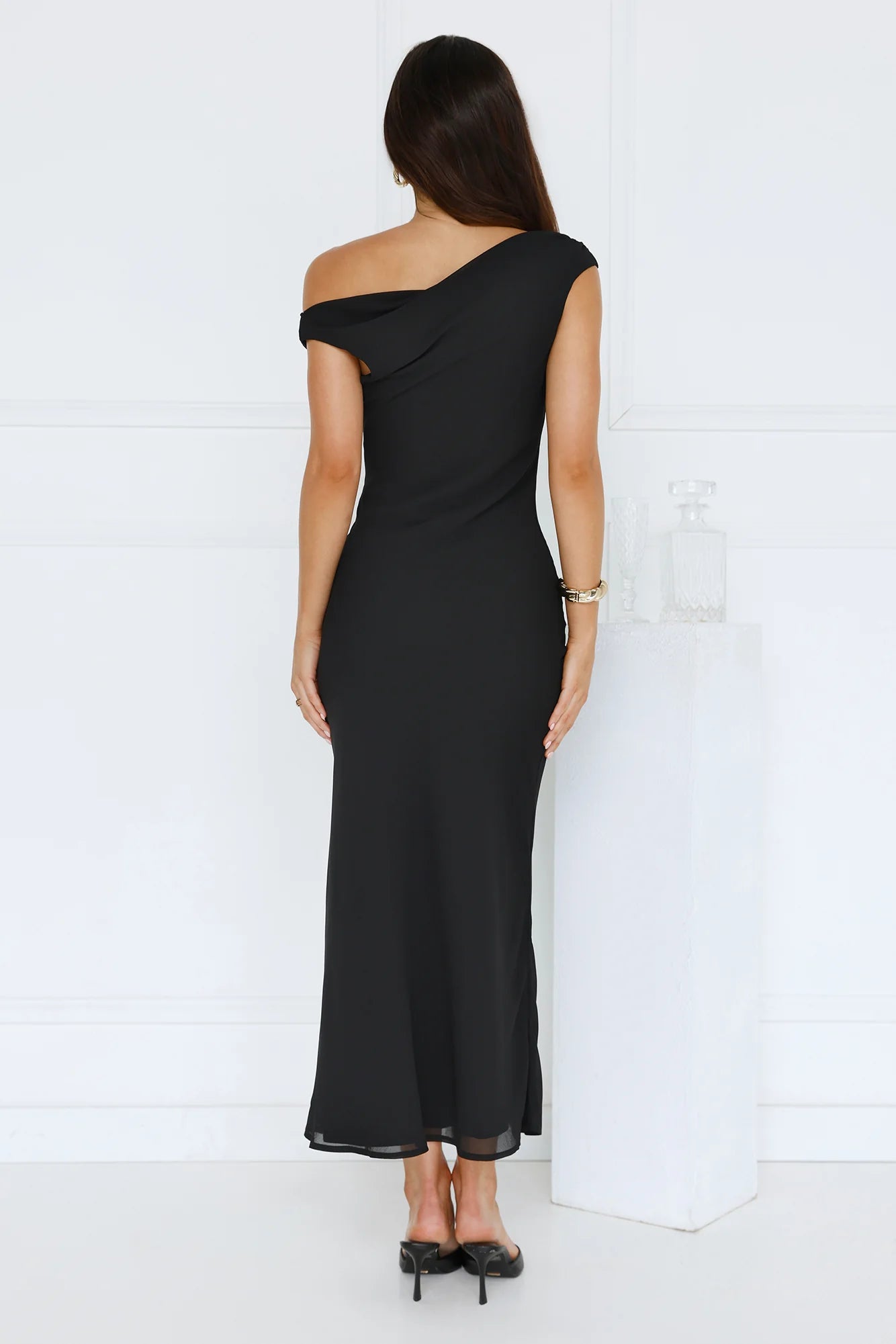 Dress to impress in the Xenia Off Shoulder Midi Dress. Featuring an off-the-shoulder strap and a straight, flowy skirt. Style with heels for a fancy event!