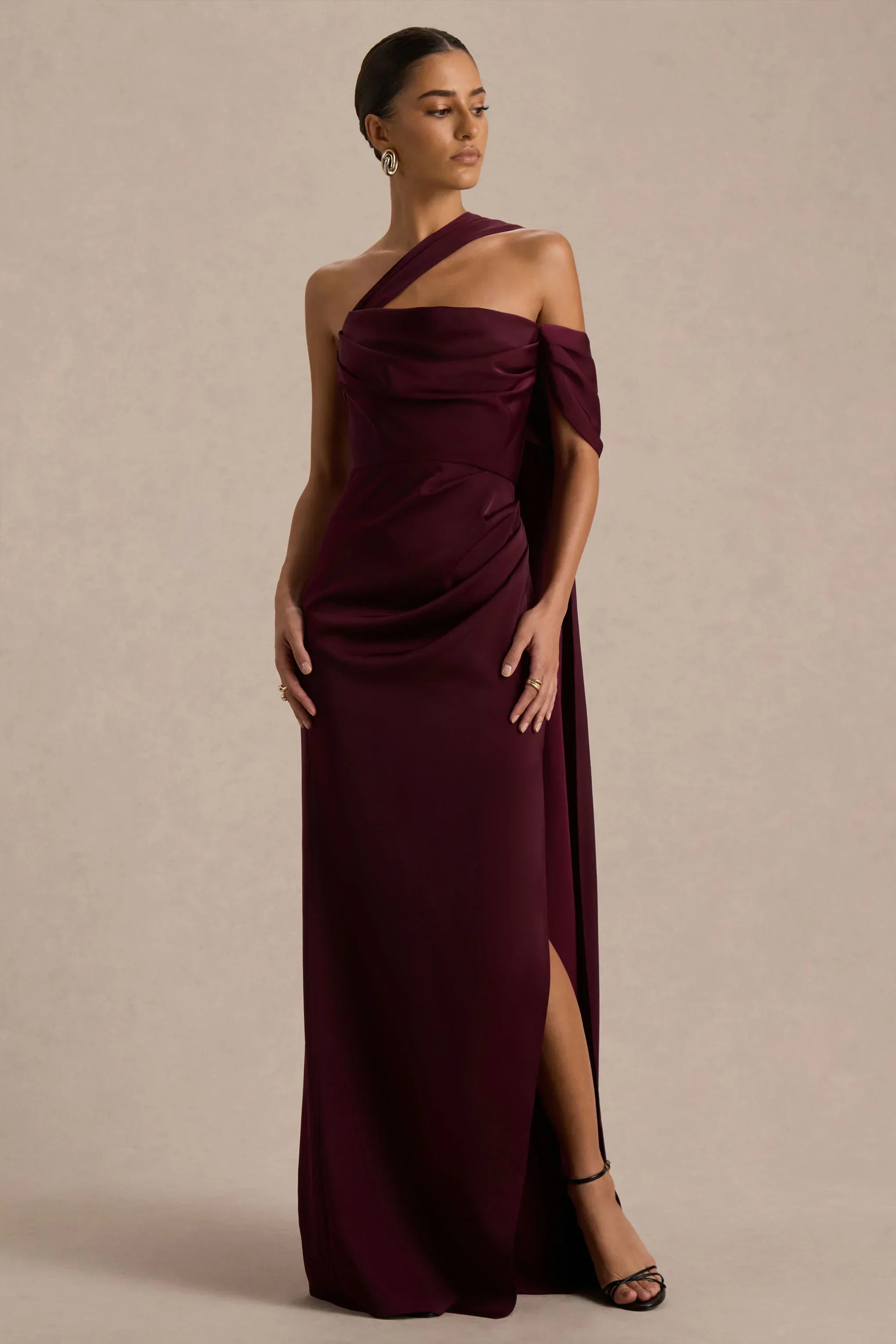 Introducing Yazmin, where red carpet glamour meets modern sophistication. Crafted from our burgundy premium satin, this stunning maxi dress is designed to command attention. The asymmetric neckline and dramatic sash detail, flowing elegantly over the shoulder and down the back, create a striking silhouette from every angle. With draped detailing at the waist to enhance your curves and a daring front-high split, Yazmin is made for unforgettable entrances and after-dark allure.